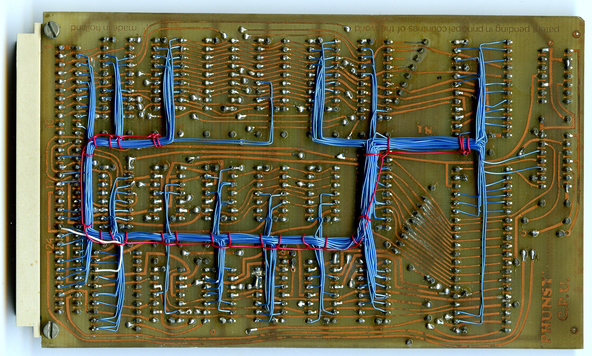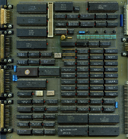| Phunsy-2 6809 micro computer. This should have been my 2nd generation system. It had lots of features but I never finished it. The other side of the board has no wires;-) Just a bit later I had an Atari ST and it was no use completing this board as it was impossible to keep up with the fast growing technology. Although the 6809 cpu never really made it, I still think this was one of the greatest 8-bit cpu's. The two missing IC's on the board should have functioned as collor look-up table for the video signal. | |